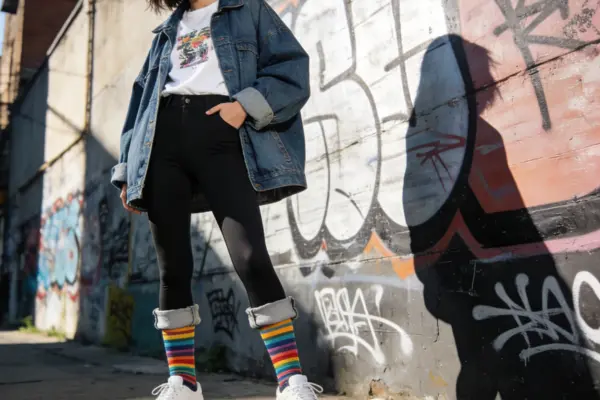 Note: For those looking to experiment with this bold trend, SocksMaven offers a range of customizable socks, allowing you to design unique patterns and colors that complement your leggings look. Whether you prefer a minimalist design or a more playful pattern, SocksMaven has the perfect socks to match your personal style.