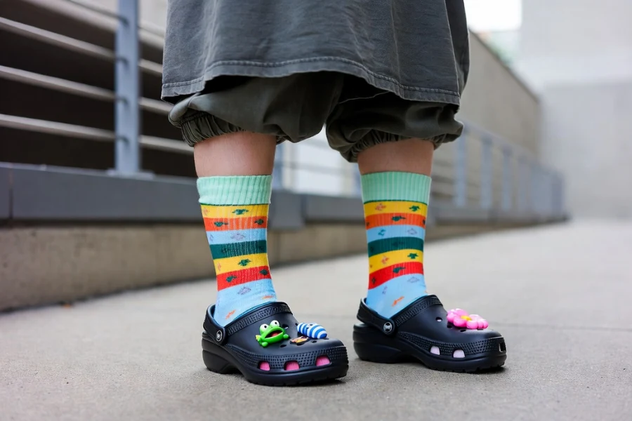 For weekends or relaxed outings, brighter Crocs combined with visible socks allow you to introduce color or pattern in a controlled way, especially when the socks echo tones from your clothing.