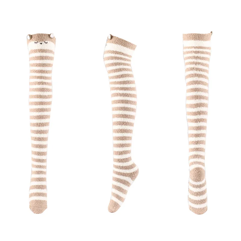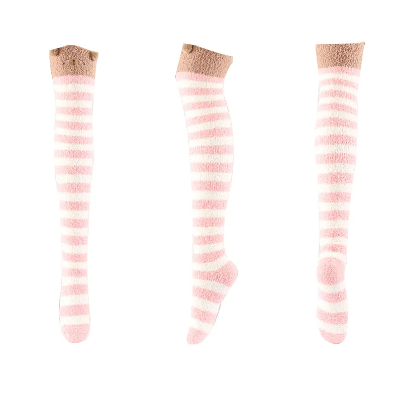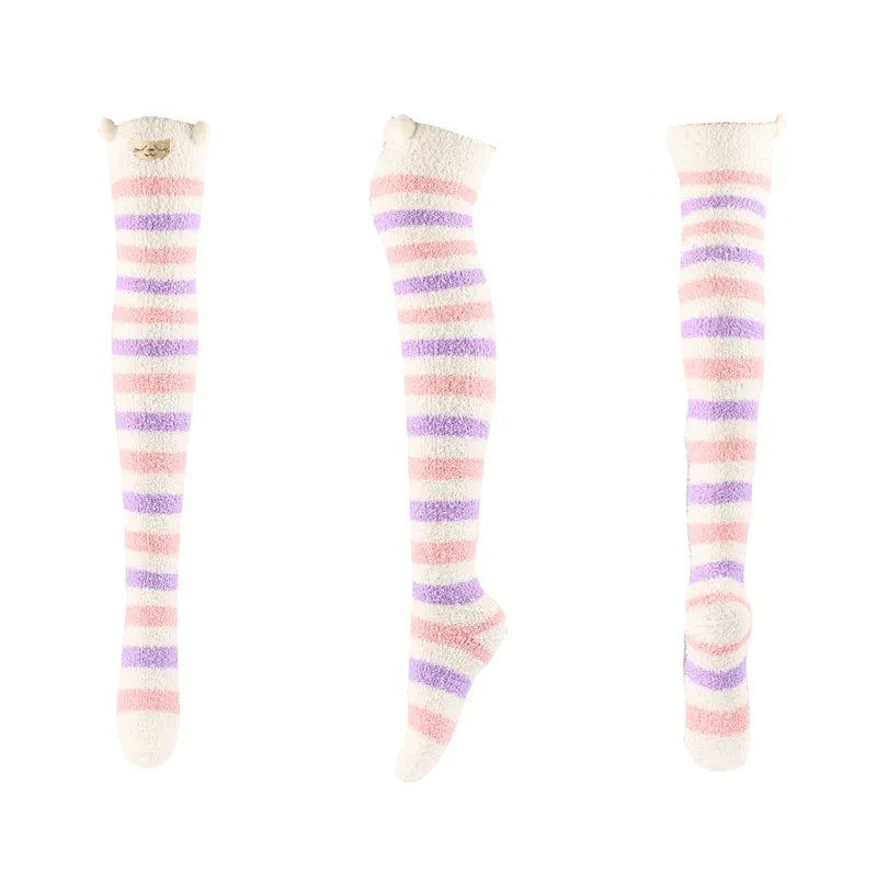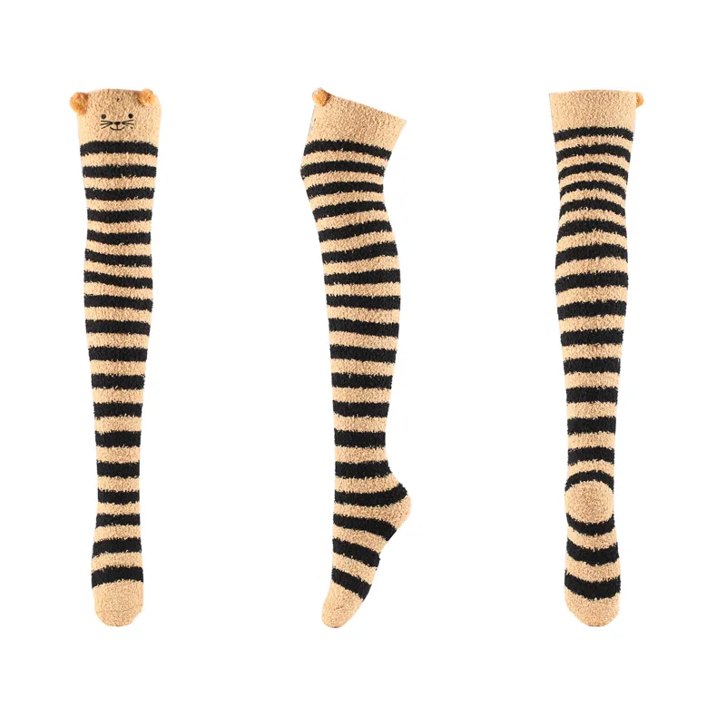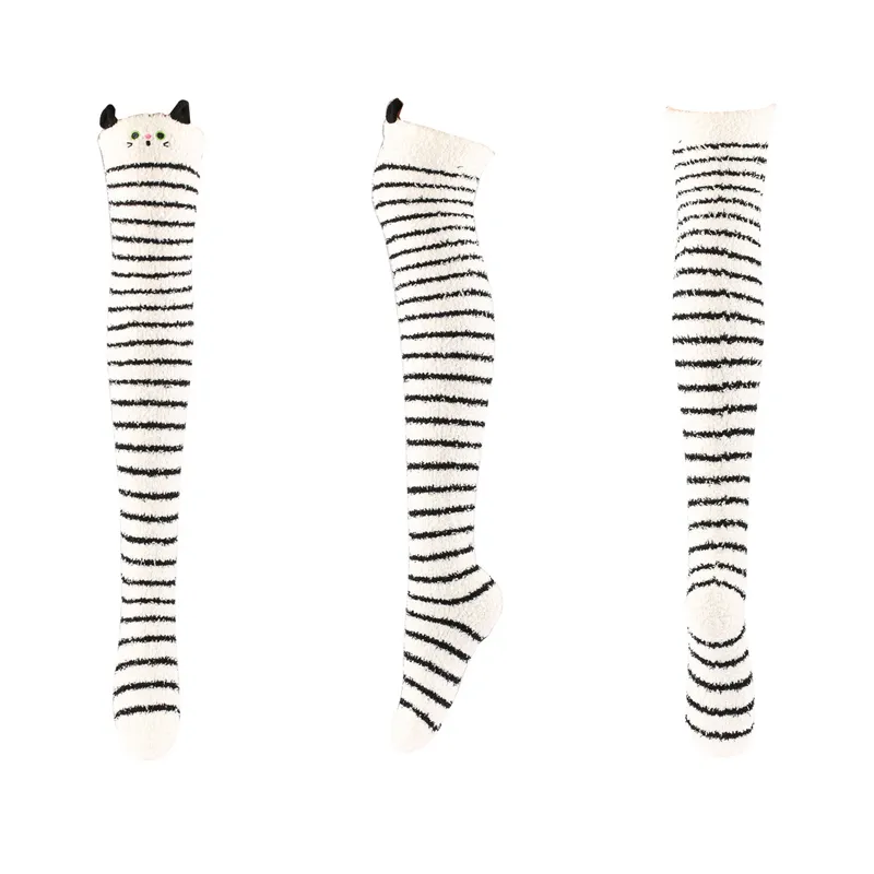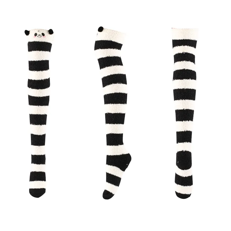 These fuzzy over-the-knee socks feature a cute panda design with black-and-white stripes. The plush fabric traps warmth perfectly, while the stretchy fit ensures a cozy, stay-put feel for cold days and loungewear.