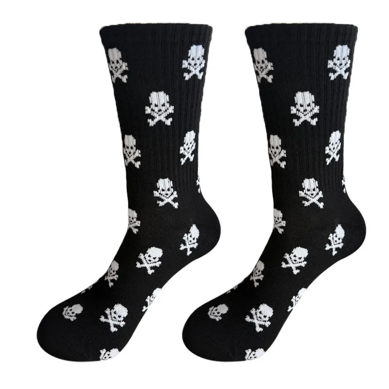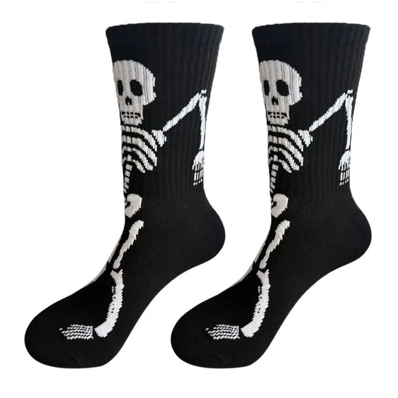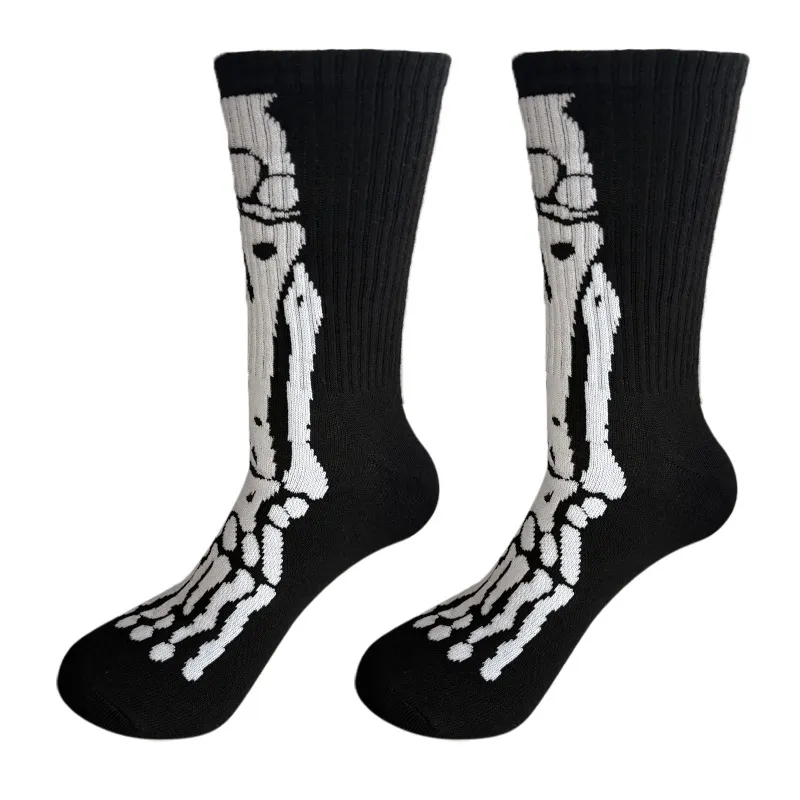 These Halloween crew socks showcase a playful dancing skeleton design for spooky fun. The thick ribbed knit offers cozy warmth and durability, while the stretchy fit ensures all-day comfort for festive outfits.