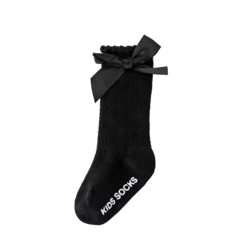 These black kids’ crew socks feature a delicate ruffled cuff and a satin bow for an elegant look. The soft, stretchy knit keeps little legs warm, while the ribbed texture ensures a secure, comfortable fit for dressy or casual wear