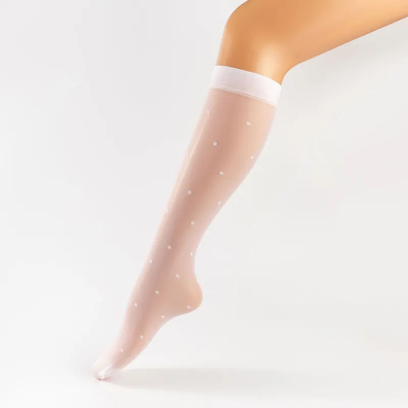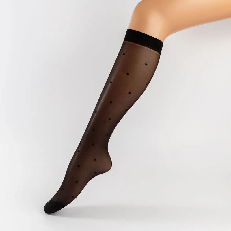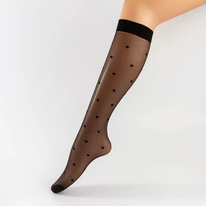 These sheer knee-high socks feature delicate heart patterns for a playful, elegant look. The wide top band stays in place comfortably, while the lightweight nylon fabric offers breathable, all-day wear.