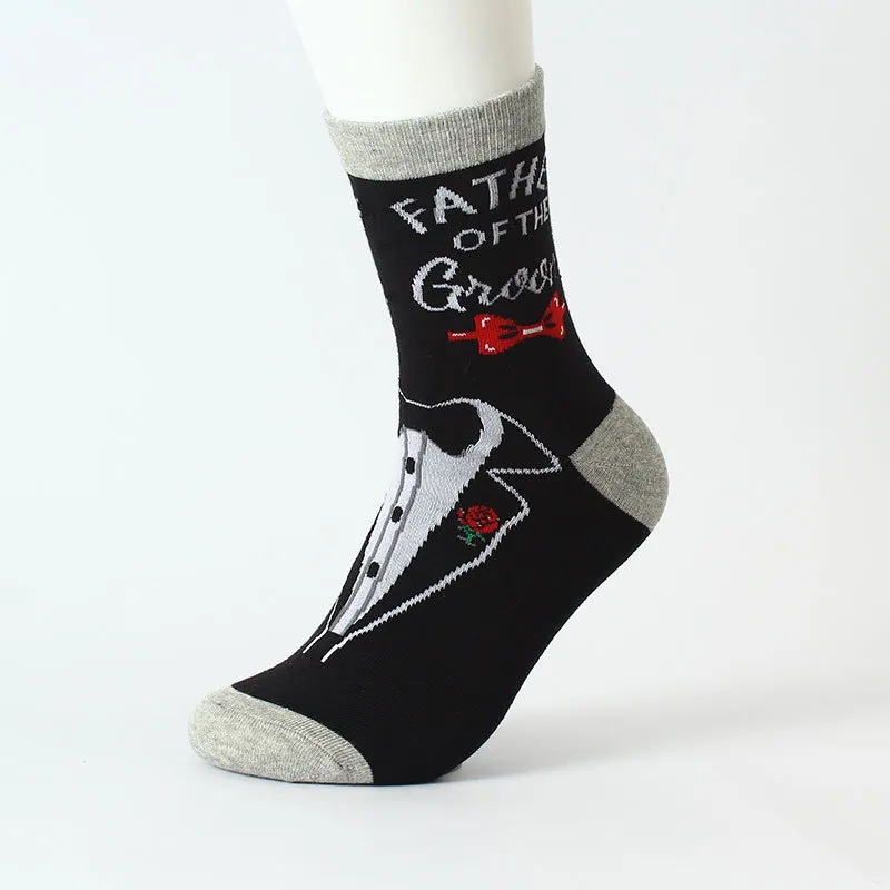 These wedding crew socks feature a tuxedo design with “Father of the Groom” text, ideal for wedding parties. The soft, durable knit offers all-day comfort, while the formal pattern adds a fun, personalized touch to the big day.