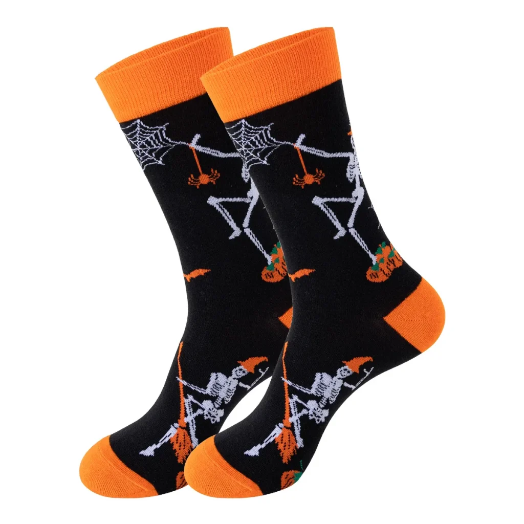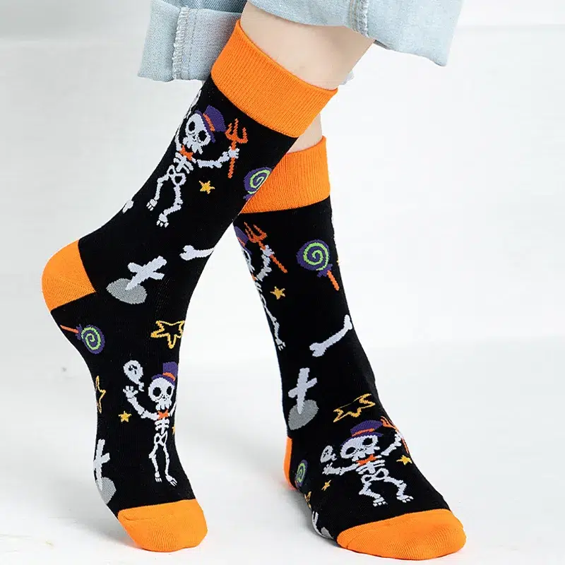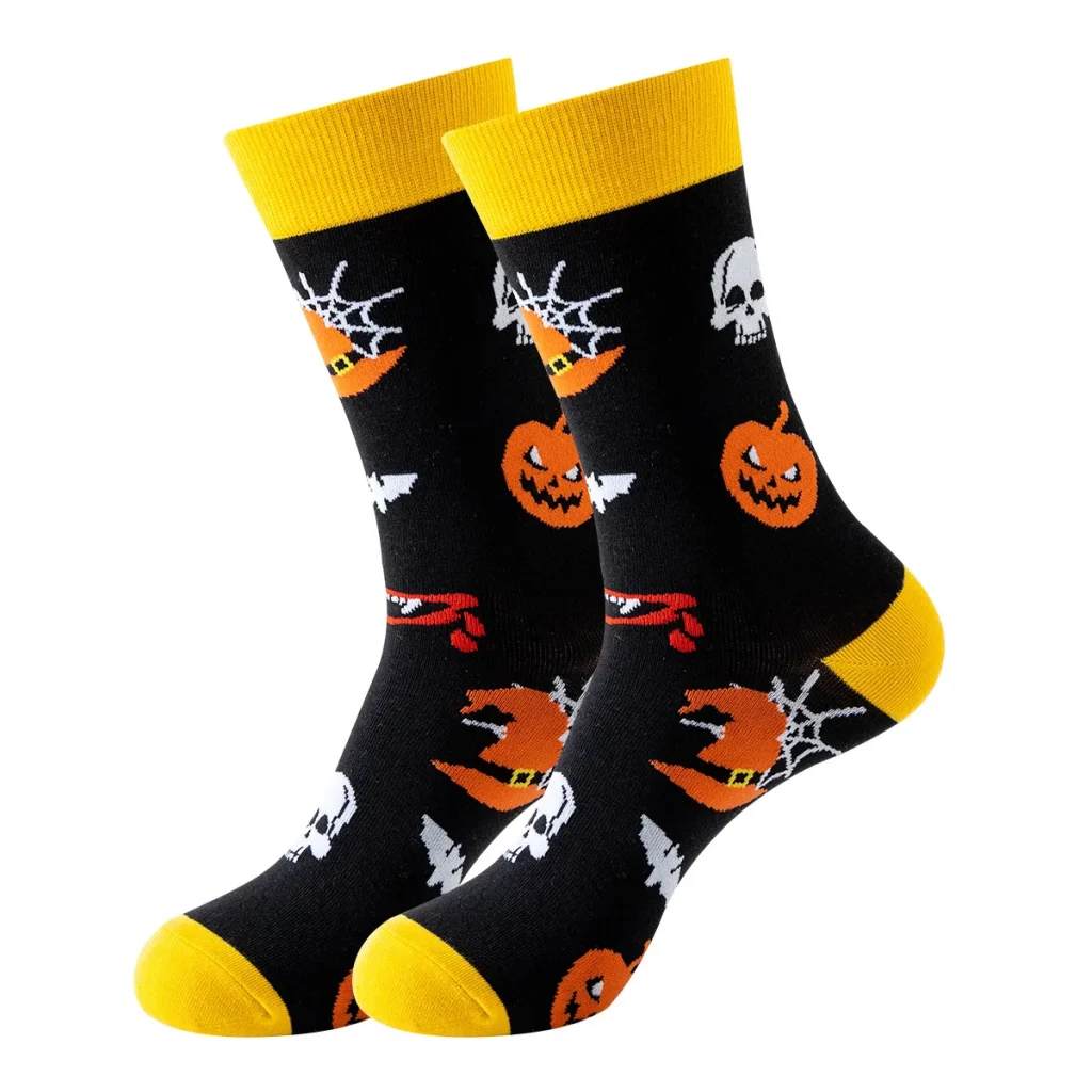 These socks are vibrant Halloween-themed mid-calf styles packed with classic spooky-fun motifs (including pumpkins, skeletons, ghosts, black cats, bats, and “Happy Halloween” slogans), making them the perfect accessory for the Halloween season.